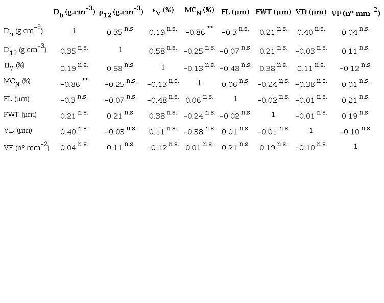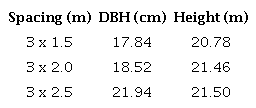 To evaluate the effect of spacing and longitudinal variations in trees on physical and anatomical properties, the variance homogeneity was initially assessed by means of Hartley's test and a subsequent F variance analysis test, in accordance with the randomized blocks experimental design. Once the F test was conducted (p>0.05), the means were compared using a Tukey test. The SAS statistical program (SAS, 1999) was used to this effect.
