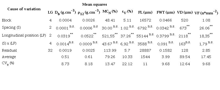 The mean values of wood basic density, apparent density, natural moisture content, and volumetric shrinkage were 0.51 g.cm-3, 0.61 g.cm-3, 79.26%, and 10.33%, respectively (Table 2). The mean values of fiber length, fiber wall thickness, diameter and vessel frequency were 1544 µm, 3.99 µm, 89.54 µm and 17.45 nº.mm-2, respectively (Table 2). No significant interaction was noted between tree spacings and longitudinal position (Table 2), which demonstrates no dependency between these two factors.