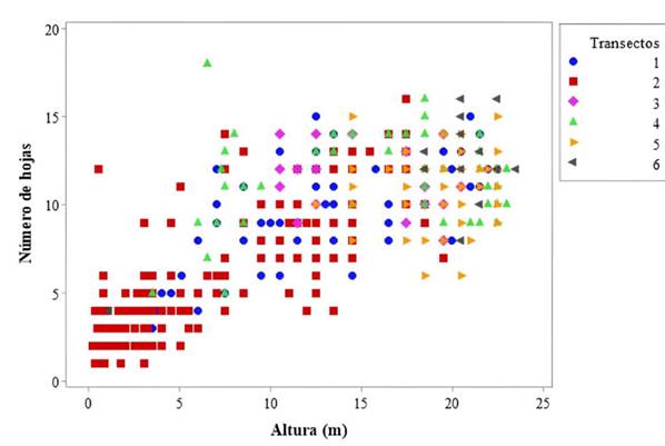 A nivel de transecto, la tendencia en forma de J invertida de las clases altimétricas en T1 y T2 está relacionada con el reclutamiento regular de individuos en la población (Resende et al., 2012), lo que sugiere una continuidad en el crecimiento, la mortalidad y la supervivencia para ascender a la siguiente clase y reemplazar los individuos ascendidos en la clase inferior (Barot et al., 1999; Araujo-Murakami et al., 2006; Sampaio et al., 2008). Entretanto, la concentración de individuos hacia los valores más altos en los demás transectos puede explicarse con lo descrito por González-B y Rial (2011): un evento simultáneo de establecimiento, reclutamiento y crecimiento de individuos de la misma altura origina un dosel continuo que puede inhibir el crecimiento de nuevos individuos por disminución de la radiación lumínica en los estratos bajos, lo cual aumenta la probabilidad de muerte por caída de hojas megáfilas (Ponce et al., 1996).