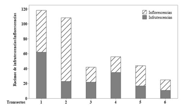 Se evidenció que alrededor del 51 % de los individuos adultos registrados para la especie se encontraron en fase fenológica (floración y/o fructificación) (Figura 2). En cuanto a la producción de racimos, se registró un total de 170 racimos de M. flexuosa en 0.6 ha muestreadas.