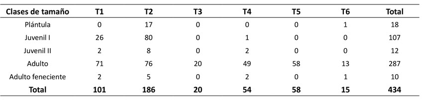 Los individuos se concentraron en los valores más bajos de las variables de altura y número de hojas en T1 y T2, que corresponden a las clases de tamaño de plántulas y juveniles. Por el contrario, T5 y particularmente T6 mostraron una agrupación hacia los valores más altos registrados para las mismas variables, mientras que, en T3 y T4, los individuos estuvieron dispersos en los valores intermedios (Figura 1).
