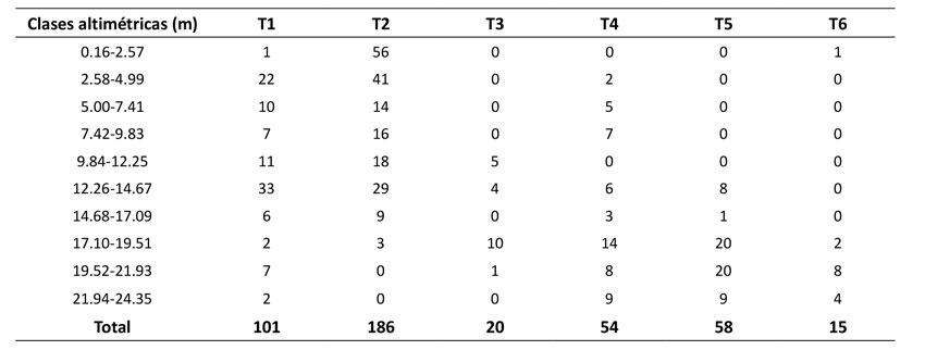 Las clases altimétricas presentaron una tendencia en forma de J invertida con asimetría positiva en las categorías entre 0.16 y 4.99 m de altura en T1 y T2, que corresponden a plántulas y juveniles. Entretanto, en los demás transectos se evidenció una distribución sesgada a la izquierda, que demuestra una disminución de las clases más pequeñas y la dominancia de individuos adultos (Tabla 2).