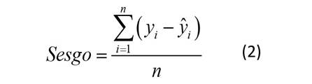 Como medidas de bondad de predicción, se utilizaron el sesgo promedio (Sesgo), el error absoluto medio (EAM) y la raíz del error medio cuadrático (REMC) (Barrios-Trilleras et al., 2021):