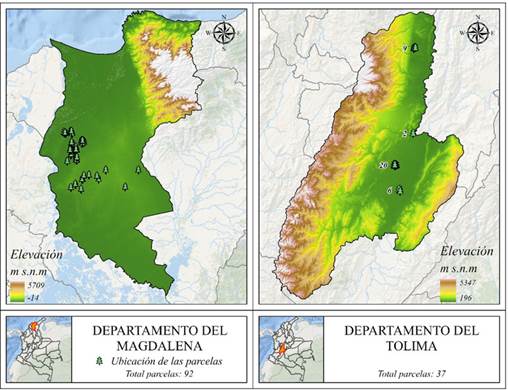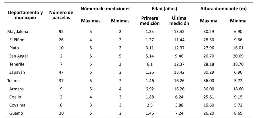 Se empleó una red de 129 parcelas permanentes de monitoreo instaladas durante el periodo 2008-2013. Las parcelas se establecieron en 5 municipios del departamento del Magdalena, ubicado en la región Caribe de Colombia, y en 4 municipios del departamento del Tolima, el cual se encuentra en la región Andina del centro-oeste del país (Figura 1). Se registraron mediciones dasométricas desde el primer año de establecimiento hasta los 16 años, con un total de 2 a 5 remediciones en cada parcela. En cada parcela y medición, se registró el diámetro a la altura del pecho (DAP), tomado a 1.30 m del suelo (DAP) con cinta diamétrica, y la altura total (HT), medida con un hipsómetro laser.