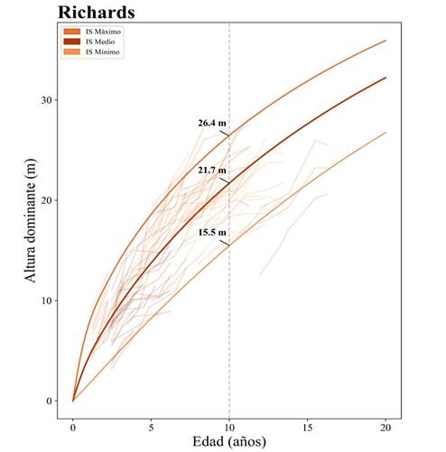 Las curvas de IS generadas por los modelos presentan diferentes tasas de crecimiento a edades tempranas (de 0 a 5 años). En edades medias o mayores de 5 años, se ve un crecimiento continuo hacia la formación de una asíntota horizontal, lo cual indica un punto de inflexión en los niveles de desarrollo de la especie. Esta información generalmente se utiliza para la planificación de prácticas silvícolas y la proyección de la productividad.