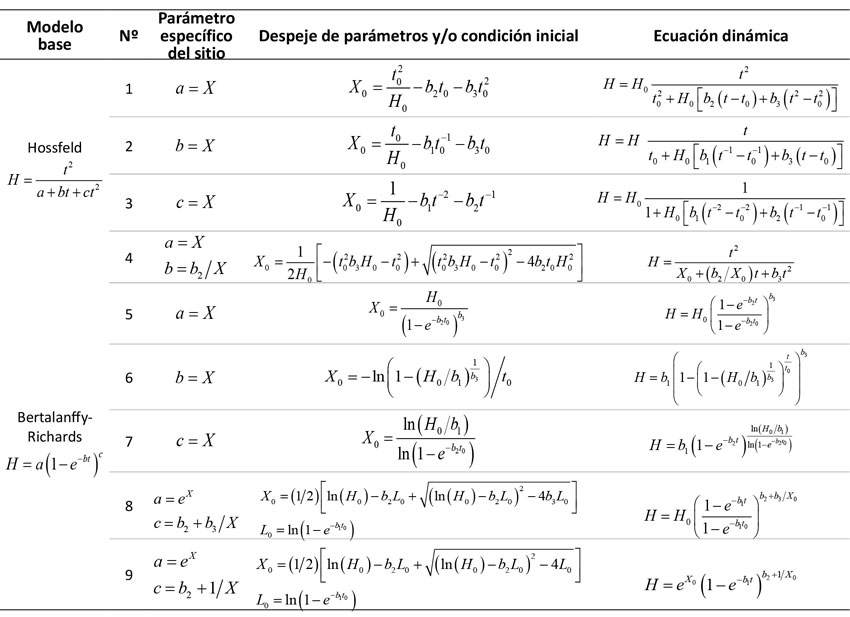 Las ecuaciones dinámicas generadas son de la forma Y = f(t, Y0, t0, βi ), donde Y y Y0 indican la altura dominante futura y la altura dominante de referencia respectivamente, t y t0 son las edades respectivas para cada altura dominante y βi representa los parámetros a estimar.