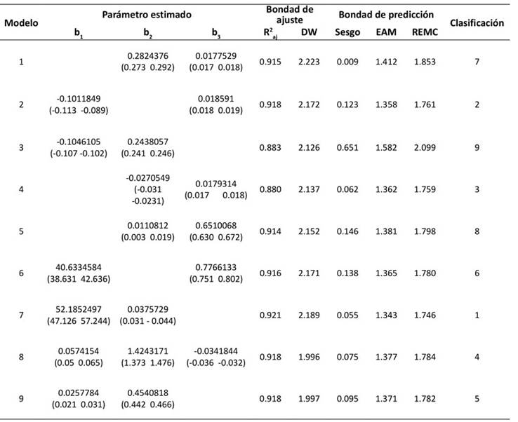 La Tabla 3 presenta el valor de los parámetros estimados, la bondad de ajuste y la bondad de predicción para los modelos evaluados, así como la calificación total de cada uno. En términos generales, los modelos restantes evaluados presentaron buenos ajustes. Todos los modelos presentaron R2aj ≥ 0.914, a excepción de los modelos 3 y 4, los cuales presentaron R2aj = 0.88.
