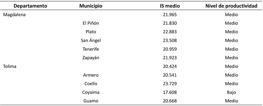 Como se evidencia en la Tabla 4, los departamentos presentan el mismo nivel de productividad. Todos los municipios fueron categorizados como de productividad media, excepto el municipio de Coyaima en el departamento del Tolima, que presenta un valor más bajo de productividad. La Ecuación (5) de IS para G. arborea según el modelo 7 se muestra a continuación: