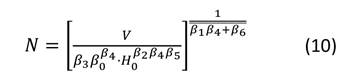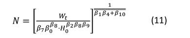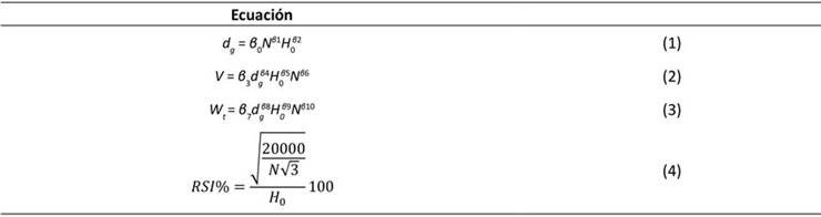 donde: N = número de árboles.ha-1, H0 = altura dominante (m), dg= diámetro medio cuadrático (cm), βi (i = 0-10) = coeficientes a estimar en el ajuste, V = volumen total (m3.ha-1), Wt = biomasa aérea total (Mg.ha-1), RSI = índice de espaciamiento relativo (%).