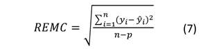 El ajuste de los modelos se midió a través del gráfico de los residuales y los siguientes criterios estadísticos: el coeficiente de determinación (R2 ) (Ecuación (6)) y la raíz del cuadrado medio del error (REMC) (Ecuación (7)). Además, se evaluó la significancia de los parámetros a un nivel de probabilidad de 0.05.