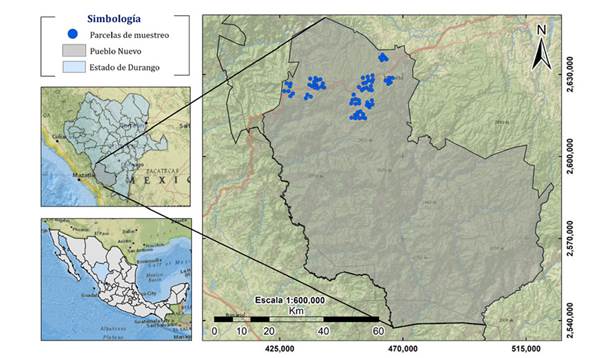 El estudio se llevó a cabo en el municipio de Pueblo Nuevo, Durango, México. Localizado entre los paralelos 22° 56’ y 23° 59’ de latitud norte y los meridianos 104° 45’ y 105° 48’ de longitud oeste (INEGI, 2010). Esta región es la más importante en el país en lo que respecta a de producción forestal (Figura 1).