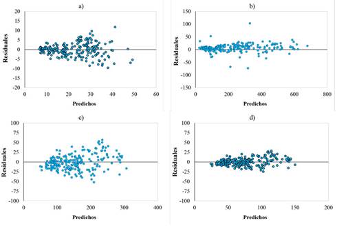 La dispersión de los residuales contra los valores predichos no presentó tendencias anómalas que hicieran suponer una violación de los supuestos de regresión como normalidad, homogeneidad de varianzas e independencia de los errores. Por lo tanto, los parámetros se consideraron adecuados para la elaboración del DMD (Figura 2).