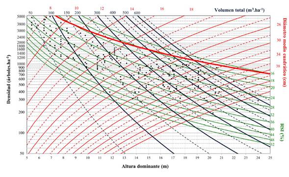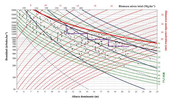 Después de obtener las estimaciones de los parámetros para el sistema de ecuaciones, se representaron las isolíneas de las variables involucradas en el diagrama. Primeramente, se expresó el nivel de espesura de la masa mediante el RSI. Las líneas para este índice se obtuvieron despejando N de la Ecuación (4) y asignando valores a RSI (Ecuación (8)). La representación de las isolíneas para el diámetro medio cuadrático se realizó mediante la Ecuación (1), estableciendo dg como un valor constante (Ecuación (9)) y resolviendo N a través de la gama de alturas (H0 ) observadas en las parcelas de muestreo. Las isolíneas para el volumen total y la biomasa aérea total se derivaron del despeje de N en las Ecuaciones (2) y (3) respectivamente. Posteriormente, se resolvió N a través del rango de la altura dominante observada (H0 ), fijando como constante V y Wt (Ecuaciones (10) y (11)). No se representaron las isolíneas para los almacenes de carbono total, ya que los valores de esta variable se obtienen del gráfico que presenta la biomasa aérea total, multiplicando el valor de Wt por el contenido de C de P. cooperi (0.489).