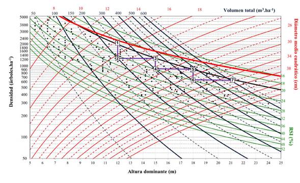 Los segmentos verticales y horizontales representan, respectivamente, las etapas de aclareos y los intervalos entre estos. Por lo tanto, la reducción de la densidad por dichos aclareos no causa un efecto directo en la altura dominante (López-Sánchez & Rodríguez-Soalleiro, 2009). De acuerdo con el DMD, la primera intervención (punto 2) se deberá realizar cuando el diámetro medio cuadrático alcance un valor de 16.5 cm y la densidad sea cercana a los 2000 árboles.ha-1. En este punto, el volumen correspondería aproximadamente a 250 m3.ha-1. De igual manera, se muestran las estimaciones de las variables para las dos intervenciones restantes (puntos 4 y 6). Las condiciones anteriores definen el punto final de cosecha en el gráfico (punto 7). En este punto resulta una densidad de 625 árboles.ha-1, un RSI de 20.5 % (Figura 4, línea negra gruesa) y existencias maderables cercanas a los 600 m3.ha-1.