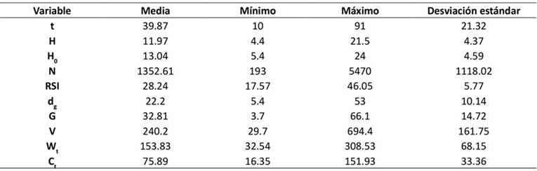 Los datos de campo fueron obtenidos de 218 sitios permanentes de muestreo (25 x 25 m) establecidos en rodales regulares puros para medir el efecto de los aclareos en el crecimiento de P. cooperi. Los sitios cubren el rango de edades, densidades y calidades de los rodales de esta especie. Se registró información de edad (t), altura dominante (H0) y altura media (H) en m; del número de árboles por hectárea (N); del diámetro medio cuadrático (dg) en cm; del área basal por hectárea (G) en m2; del índice de espaciamiento relativo (RSI) en %; del volumen total del rodal (V) en m3.ha-1; y de biomasa aérea total (Wt ) y carbono (Ct ) en Mg.ha-1. En la Tabla 1 se presenta el resumen de las estadísticas descriptivos de las variables utilizadas para la construcción de los DMD.