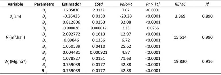 Los estimadores de los parámetros de las ecuaciones resultaron ser significativos a un nivel de 5 % (p<0.05). En la Tabla 3 se presentan los estimadores, su error estándar y su significancia, así como los estadísticos de bondad de ajuste del sistema de ecuaciones (dg, V y Wt). El diámetro medio cuadrático se modeló con menor precisión. No obstante, el ajuste se consideró aceptable, ya que la ecuación explicó más del 88 % de la variabilidad de los datos de diámetro cuadrático de las parcelas. Las ecuaciones que obtuvieron los valores más altos de R2 fueron las de volumen total y biomasa aérea total, explicando alrededor del 99 y 92 % de la variabilidad observada respectivamente. El valor de la raíz del error medio cuadrático (REMC) de la ecuación de dg fue 3.36 cm, mientras que, para las ecuaciones de V y Wt , este estadístico presentó valores de 15.51 y 19.83 Mg.ha-1 respectivamente.