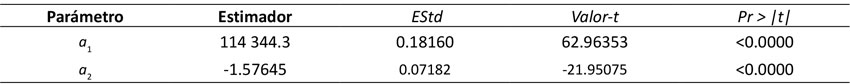 En la Tabla 4 se muestran los estimadores de los parámetros de la ecuación que define el límite de densidad máxima, obtenidos mediante el ajuste de la regresión cuantílica no lineal. La pendiente de la línea de autoaclareo fue -1.5764, un valor muy cercano al teórico (-3/2), ampliamente reportado en estudios sobre densidad. Los estimadores resultaron ser significativos al 99 %.