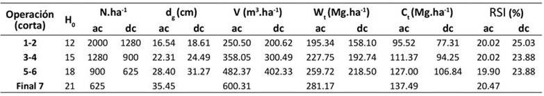 Con el esquema de cortas propuesto, y de acuerdo con modelo desarrollado, la biomasa aérea total extraída durante el primer, segundo y tercer aclareos ascendería a 37.2, 35 y 41.2 Mg.ha-1 respectivamente, alcanzando un valor aproximado de 281 Mg ha-1 al final de la rotación, mientras que la cantidad de carbono aéreo total extraído (calculado con una proporción de carbono de 0.489) alcanzaría los 18.2, 17.1 y 20.2 Mg.ha-1. Al final de la rotación, se obtendría un valor de contenido de carbono de 137.5 Mg.ha-1 (Tabla 5). Los valores finales de V y Wt y Ct son superiores a los reportados en diferentes estudios realizados en la misma región, cuyos objetivos fueron estimar el volumen y el contendido de biomasa y carbono en bosques templados (Návar et al., 2005; Nájera & Hernández, 2009; Graciano-Ávila et al., 2019).