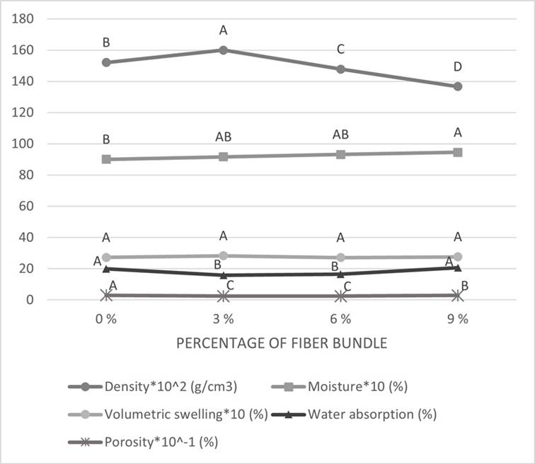 The following tests were conducted: moisture content (gravimetric method), density (DIN 52361; DIN, 1965a), water absorption (DIN 52364; DIN, 1965c), and porosity and volumetric swelling after 24 h of water immersion. Furthermore, the reduction in thickness was determined, following the application of a 39.23 MPa (400 Kg.cm-2) load (DIN 53291; DIN, 1982), as well as the modulus of rupture (MOR), at a speed of 6.35 mm/min (0.25 inch/min) (DIN 52362; DIN, 1965b).
