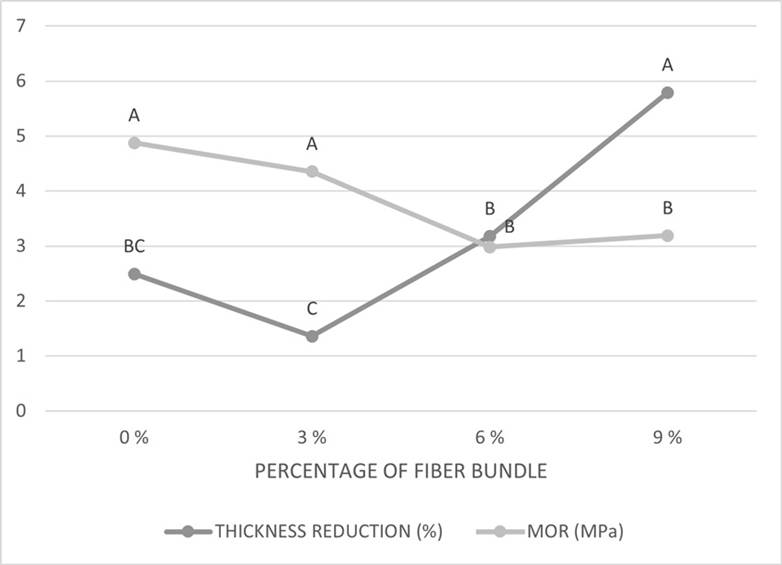 The mechanical properties tested were thickness reduction and modulus of rupture (MOR). The results are shown in Figure 2.
