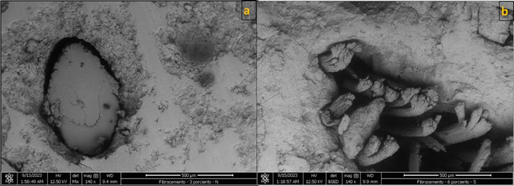 The interplay between cement and fibers was examined, as well as the internal structure of the FCC, using a scanning electron microscope (SEM; Thermo Scientific, Quantum 250, USA) with 12.5 and 15 kV acceleration voltages and 34X and 140X magnification. The samples were previously prepared and coated with a diluted gold solution.
