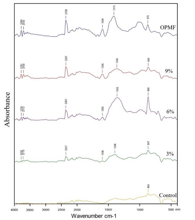 The FTIR graph illustrates the spectra of the FCCs and the OPMF, which was reported in a study on bamboo fiber-reinforced cement composite (Alencar et al., 2023). The differing vibration intensities (peaks) observed between spectra are dependent on the fiber content (Feng et al., 2023).