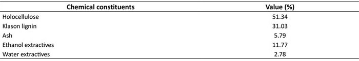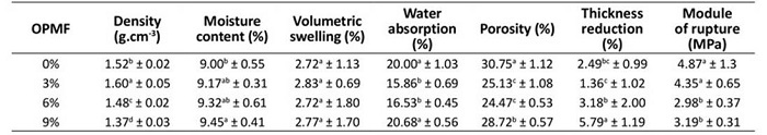The chemical composition of the OPMF is shown in Table 1. The following parameters were determined: holocellulose (Jayme-Wise’s method), Klason lignin (T 222 om-98; TAPPI, 1998), ash (T 211 om-93; TAPPI, 1993), ethanol extractives (T 204 cm-97; TAPPI, 1997), and water extractives (T 207 cm-99; TAPPI, 1999). The values of chemical constituents were found to be consistent with those reported by Momoh and Osofero (2020) .