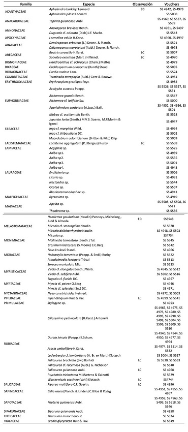 Para la determinación taxonómica, se revisaron las colecciones del Herbario LLANOS y las colecciones botánicas de los herbarios virtuales COAH, UDBC y COL, además de literatura especializada (Gentry, 1993; Quiñones, 2001; Mendoza et al., 2004). La nomenclatura botánica se basó en el sistema de clasificación APG IV (Chase et al., 2016), y se validaron los nombres científicos aceptados en la base de datos Plants of the World Online (POWO, 2023). Las colecciones botánicas fueron depositadas en el Herbario LLANOS después del proceso de determinación.