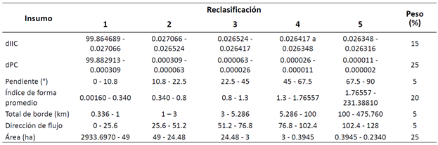 Una vez identificadas las variables con mayor influencia en la conectividad del paisaje, se reclasificó cada ráster con el fin de priorizar rangos críticos para la conectividad, y a cada uno se le asignó un porcentaje de importancia (Tabla 1).