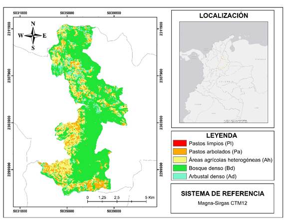 Se realizaron recorridos de campo en el área de estudio para generar un conjunto de datos de entrenamiento, siguiendo la leyenda de coberturas de tierra de la metodología Corine Land Cover adaptada para Colombia (IDEAM, 2010) y el mapa nacional de coberturas de tierra (IDEAM & MADS, 2018). Se registraron un total de 270 puntos de entrenamiento georreferenciados, con los que se realizó una clasificación supervisada de las coberturas del suelo (pastos limpios, pastos arbolados, áreas agrícolas heterogéneas, boque denso y arbustal denso) usando el algoritmo Random Forest (RF) (Bivand & Rundel, 2022; Breiman, 2001; Edzer, 2018; Hijmans, 2023). Como datos de entrenamiento adicionales, se calculó el índice de vegetación de diferencia normalizada (NDVI) y, para la banda near-infrared (NIR), se estimaron medidas de texturas como varianza, media, homogeneidad, contraste, disimilitud, entropía y segundo momento (Bolívar-Santamaría & Reu, 2021). Para comprobar la precisión de la clasificación supervisada, se validó el modelo RF con la tasa de error out-of-bag (OOB), que tiene en cuenta las observaciones no incluidas en la construcción de los árboles de decisión (Moham-madpour et al., 2022).