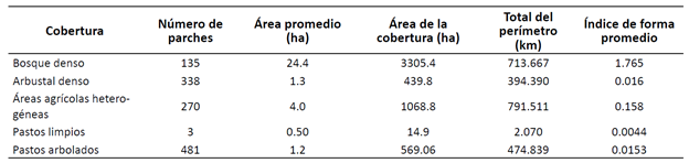 Las coberturas con mayor perímetro total son las Ah, con 791.5 km, seguidas por el Bd con 713.6 km y los Pa con 474.8 km. Por su parte, las coberturas con menor perímetro son el Ad con 394.4 km y los Pl con 2.1 km. El índice de forma permitió conocer que la cobertura de Bd tiene una forma irregular, con un valor medio de 1.76. Para las coberturas Pl, Pa, Ah y Ad, se identificó que las formas de los parches tienden a ser simples y cuadradas, con valores promedio de 0.048.