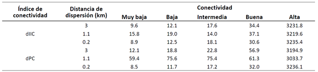 Los resultados revelan que, a medida que aumenta la distancia de dispersión, las áreas de hábitat asociadas con la conectividad experimentan cambios notables en su extensión. En el caso del dIIC, las áreas varían entre 9.6 y 3235.4 ha, mientras que, para el dPC, se extienden desde 8.5 hasta 3236.1 ha. Los valores más altos de conectividad para ambas métricas se observan en la categoría alta, destacando la importancia de la conservación y el fortalecimiento de corredores naturales en los hábitats estudiados.