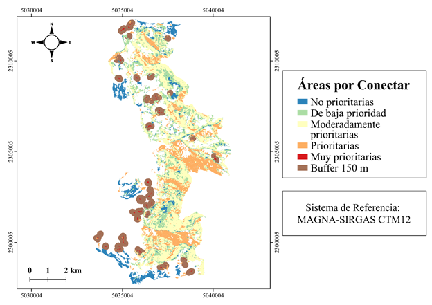 De acuerdo con el AMC, se identificaron zonas a conectar muy prioritarias, las cuales representaron una extensión total de 19.392 ha, i.e., el 0.5 % de la cobertura boscosa total (Figura 2). Estas zonas se consideraron críticas porque presentan índices de conectividad bajos, pendientes abruptas que dificultan el movimiento de especies y la dispersión de semillas, y áreas de parches pequeñas e irregulares, que son más vulnerables a la fragmentación y a los efectos de borde.