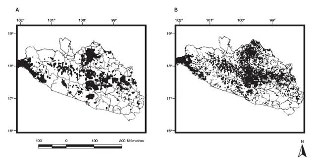 En contraste con su elevada biodiversidad, Guerrero cuenta con menos del 0.1% de su territorio decretado como área protegida ( Bezauri-Creel, Torres, Ochoa y Castro-Campos, 2012) y se calcula que, a la fecha, ha perdido alrededor del 32% de su hábitat natural ( Semarnat, 2009) y, menos del 30% de los hábitats naturales actuales pueden ser identificados como vegetación primaria ( Semarnat, 2008). Anualmente, se pierde entre el 0.5 y 0.7% de la cobertura de bosques y 2.4 y 2.7% de selvas tropicales, además de encontrarse entre los estados con mayor fragmentación de bosques y selvas en México (22-24%), con una tasa anual entre 23.7 y 36.3% de sobre-pastoreo ( Semarnat, 2008). Guerrero se ubica como uno de los estados con mayor marginación social y pobreza en México, situación que se traduce en fuertes presiones socioeconómicas para cambiar el uso de suelo de áreas con vegetación natural remanente a sistemas agropecuarios ( Deininger y Minten, 1999; Figueroa, Sánchez-Cordero, Meave y Trejo, 2009).