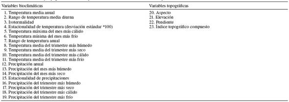 Las coberturas utilizadas para modelar la distribución de los hábitats potenciales de las especies, consistieron en 19 variables bioclimáticas del proyecto WorldClim, construidas con base en la interpolación del promedio mensual de datos de estaciones climáticas, obtenidos del periodo de 1950-2000 ( http://www.worldclim.org/current), y 4 variables topográficas del proyecto Hydro1k ( http://edc.usgs.gov/products/elevation/gtopo30/hydro/), con una resolución de ≈1 km 2 ( Tabla 1).