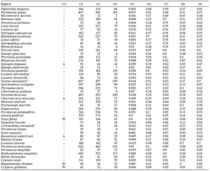 De acuerdo con la Carta digital de uso de suelo y vegetación 1:250 000, Serie IV ( Inegi, 2009), se observó que el 68% del área del estado cuenta con hábitat natural remanente. Para México, se observó una tendencia positiva no significativa entre la amplitud de la distribución potencial de los hábitats adecuados de las especies y sus distribuciones actuales (r s= 0.184, p= 0.216). También en la escala del país, 20 especies conservaron menos del 60% de vegetación natural respecto a su distribución potencial, 22 especies conservaron entre el 60 y 70%, 2 especies entre el 70 y 80% y, 3 especies conservaron entre el 80 y 90% ( Tabla 2); la mediana fue del 61%.