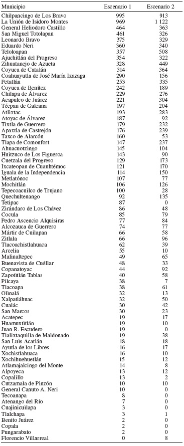 La solución de conservación en el escenario de la distribución de hábitats adecuados actuales incluyó áreas pertenecientes a 70 de los 81 municipios del estado; no se encontraron diferencias significativas al comparar la localización, de acuerdo con el municipio, de las áreas seleccionadas en ambos escenarios (N= 69, T= 1 163.5, Z= 0.263, p = 0.79). Los municipios con mayor proporción de área seleccionada fueron: Chilpancingo de Los Bravo, La Unión de Isidoro Montes de Oca, General Heliodoro Castillo, San Miguel Totolapan, Leonardo Bravo, Eduardo Neri, Teloloapan, Ajuchitlán del Progreso, Josué Azueta, Coyuca de Catalán, Coahuayutla de José María Izazaga, Petatlán, Coyuca de Benítez, Chilapa de Álvarez y Acapulco de Juárez (ver Tabla 3).