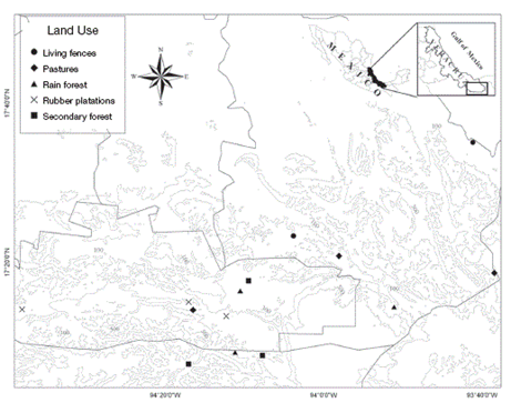 The Uxpanapa region is located in the southwest of the state of Veracruz and neighbouring areas in the state Oaxaca, in Mexico (17°47'24"-16°59'24" N, 94°19'12"-93°43' 12" W). The topography is relatively flat to gently sloping; elevation is 100-300 m asl. Soils are mainly derived from sedimentary limestone rock, shale and sandstone ( Williams-Linera, 1983). The climate is classified as hot and humid, with rains in the summer and a dry season from March to June. Average annual temperature is 24.4 °C and precipitation is 3,640 mm ( Rodríguez-Luna et al., 2011). The predominant type of vegetation is tropical rain forest that usually grows on lateritic soils that are well drained and rich in organic matter, with a canopy height of 35 m and some individuals reaching 45 m. The most representative species in the understory are Rinorea guatemalensis, Astrocaryum mexicanum, Chamaedorea tepejilote and Brosimum alicastrum. The Uxpanapa region has been severely affected by human activity over the last 50 years, with an estimated 80% of the original vegetation being transformed. The current landscape is dominated by cattle pastures, rubber plantations and subsistence agriculture ( Rodríguez-Luna et al., 2011). The most predominant understory plant species in the secondary forest are Psychotria grandis, Rinorea guatemalensis, Astrocaryum mexicanum, Guarea glabra and Chamaedorea tepejilote. Rubber plantations are characterized by Hevea brasilensis, Piper hispidum, Casearia commersoniana, Piper nitidum and Cecropia obtusifolia. Living fences are formed mainly by adult trees of Gliricidia sepium, Miconia argentea, Stemmadenia donnell-smithii, and saplings of Schizolobium parahyba. Finally, pastures have species such as Stemmadenia donnell-smithii, Zanthoxylum sp., Cordia alliodora, Miconia argentea and Psidium guajava (López-Acosta, pers. com.).