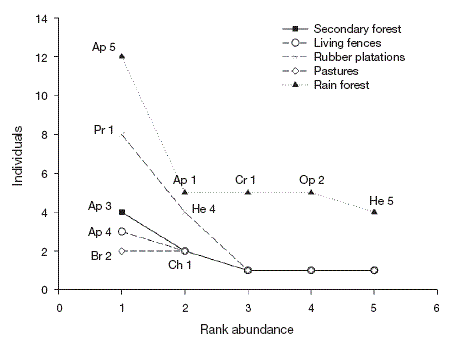 Magurran, 2004). For each type of land use, we plotted the relative abundance of each species against species rank, from the most to the least abundant species (