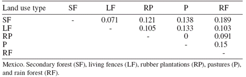 The low abundance and richness of Braconidae we report for living fences, pastures and rubber plantations reflects a negative effect of changes in land use on the Braconid community. Our study revealed that the Braconid wasp fauna of the preserved rain forest was different from that of other, more anthropic land use types, but even the latter offer some hosts for Braconid wasps. This underscores the importance of all of the landscape elements in the conservation of Braconid wasps. Together, the 4 land use types and preserved forest of Uxpanapa may host different assemblages of Braconid species that can contribute to different ecological processes.