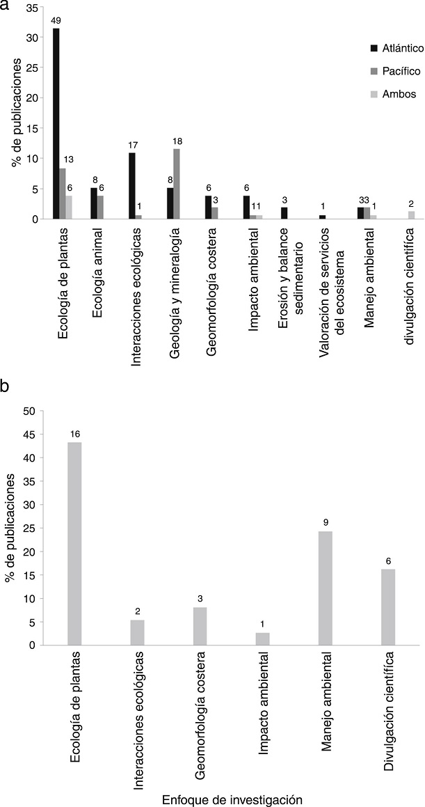 Se analizaron 156 artículos científicos, 3 libros y 37 capítulos de libros. Los artículos están publicados en 87 revistas, de las cuales el 85% son revistas internacionales indexadas con factor de impacto de 0.15 a 8.2, puntaje común en el área de ecología, que es el tema más publicado. Por esta razón, el mayor conocimiento (72%) de las revistas de las DC mexicanas está en inglés. Casi la mitad (44%) de los artículos científicos son estudios descriptivos de ecología vegetal, el 25% son de geomorfología, mineralogía y/o geología de las DC, de las interacciones ecológicas (12%) y de ecología animal (9%) (fig. 1a). Muy poca investigación (5%) se ha publicado sobre diagnósticos integrados referentes al impacto ambiental y riesgo costero, y solo el 4% de los artículos se enfocan en las dunas como elemento importante del manejo integrado de la zona costera y/o para la valoración de servicios del ecosistema (1%). Resalta la predominancia de estudios con enfoque en la ecología vegetal e interacciones ecológicas realizados en el Atlántico, mientras que los estudios sobre geología y mineralogía han sido más abundantes en el Pacífico. En el caso de los capítulos de libro, los estudios también se han enfocado en las descripciones de la vegetación (ecología vegetal) (43%); sin embargo, se observa un gran número (24%) de estudios dirigidos al planteamiento de estrategias de manejo ambiental y a la divulgación científica (fig. 1b).
