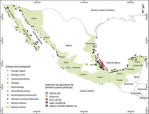El análisis de la localización de las investigaciones dibuja un mapa muy interesante de la geografía del conocimiento que se tiene sobre las DC de México (fig. 2). El 65% de las investigaciones publicadas son de las dunas del golfo de México y mar Caribe, y solo el 28% son de las dunas del Pacífico. Únicamente 4 artículos describen las dunas de ambos litorales y 6 son descripciones generales o taxonómicas que no se refieren a un sitio en particular. La mayoría de los estudios ecológicos se han llevado a cabo en la costa del océano Atlántico, pero la investigación geológica se ha realizado predominantemente en la costa del Pacífico. Se registraron 289 sitos estudiados en 14 de los 17 estados costeros. Por mucho, las dunas del golfo de México y mar Caribe son las más estudiadas (167 sitios), en contraste con 122 sitios en el Pacífico. Destaca Veracruz como el estado costero con mayor número de sitios estudiados (97), seguido de Sonora y Baja California Sur (35 y 33, respectivamente). El hecho de que las DC del Atlántico hayan sido más estudiadas, en particular la costa del centro del golfo de México, se debe al establecimiento de una estación de investigaciones biológicas (La Mancha) que ha servido de laboratorio experimental para muchos investigadores. Por otro lado, las DC del norte de la península de Yucatán también se han estudiado intensamente por la ubicación de centros de investigación en las inmediaciones; por ejemplo, Centro de Investigaciones de Yucatán (CICY), Universidad Autónoma de Yucatán (UADY) o del extinto Instituto Nacional de Investigaciones sobre Recursos Bióticos (Inireb). Aunque la ecología de las DC del Pacífico norte-noroeste parece que ha sido estudiada, en realidad se debe solo a 3 estudios regionales (Johnson, 1977, 1982 y Peinado et al., 2011). El difícil acceso a este litoral no ha ayudado a la investigación intensiva del mismo. Las DC del Pacífico sur casi no se han estudiado (fig. 2), debido probablemente a que solo recientemente se abrieron centros de investigación en estas zonas; también puede deberse al hecho de que las DC están estabilizadas con vegetación de selvas bajas, y por ello no son consideradas como vegetación de DC por los especialistas: 283 autores (66% nacionales, 34% extranjeros: 20% de Estados Unidos de América) de 91 instituciones (10% nacionales, 11% de Estados Unidos de América, el 79 restante dividido en otros 16 países) han realizado trabajos sobre DC en el país. Cabe destacar que el 77% de los autores solamente han participado en una publicación; del resto destacan: M. L. Martínez (32 artículos, 6 capítulos de libro), P. Moreno-Casasola (30 artículos, 19 capítulos), J. J. Kasper-Zubillaga (13 artículos) e I. Espejel (10 artículos, 6 capítulos). Las instituciones con mayor número de autores adscritos son la Universidad Nacional Autónoma de México (51), el Instituto de Ecología, A. C. (43), el Centro de Investigaciones Científica de Yucatán, A. C. (16) y la Universidad Autónoma de Baja California (10).