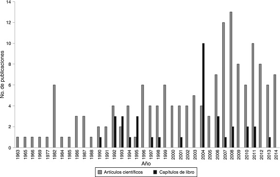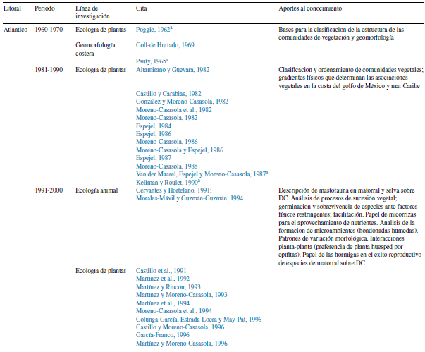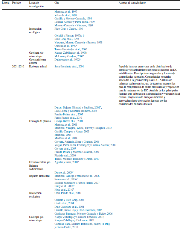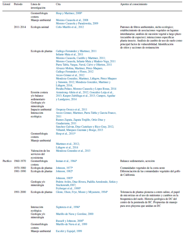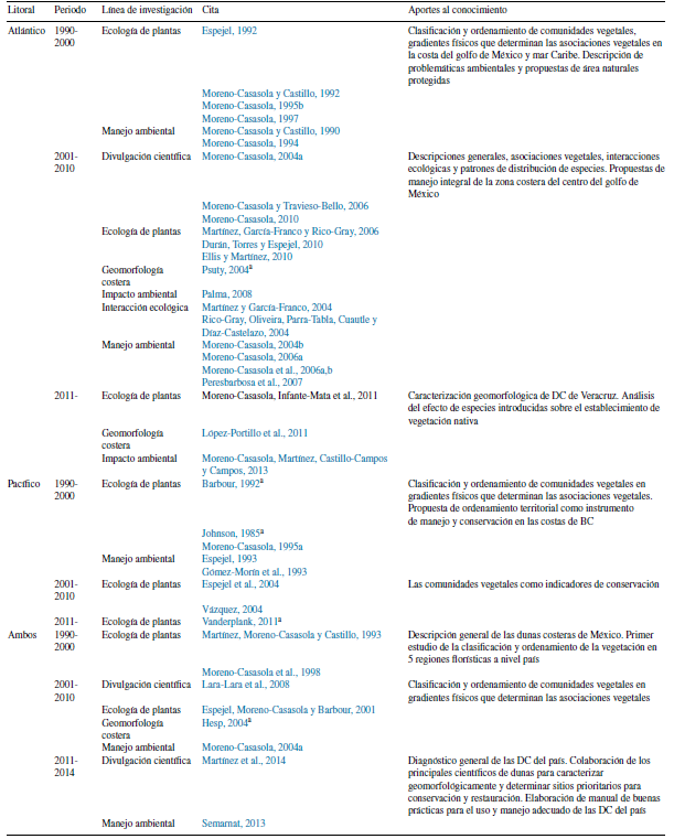 La investigación en DC en México es un tema relativamente reciente. Aunque se registraron publicaciones desde principios de 1960, no fue hasta 1982 que se incrementaron las publicaciones y se ha mantenido la producción (fig. 3; anexo 1). Las primeras publicaciones registradas fueron de investigadores extranjeros en el tema de dinámica vegetal y sedimentaria de DC (Inman, Ewing y Corliss, 1966; Poggie, 1962; Psuty, 1965) (anexo 1). El inicio de las investigaciones ecológicas en países latinoamericanos como México data de hace 50 años (Martínez, Manson et al., 2006) porque la formación de científicos naturales comenzó apenas a mediados del siglo XX (Guevara y Moreno-Casasola, 1995). La formación de especialistas y grupos de investigación mexicanos sobre DC se refleja en las décadas 1990-2010, y la mayor producción se presenta en la última década.