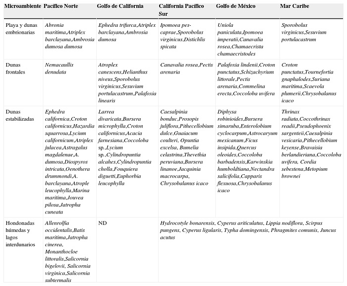 Por otro lado, los patrones de distribución de vegetación en las costas del Atlántico, así como el golfo de México y mar Caribe, han sido estudiados por Castillo y Moreno-Casasola (1998); Castillo, Popma y Moreno-Casasola (1991); Espejel (1984, 1986, 1987); Moreno-Casasola (1988); Moreno-Casasola y Espejel (1986); Moreno-Casasola, Maarel, Castillo, Huesca y Pisanty (1982), Moreno-Casasola et al. (1998), entre otros. Moreno-Casasola y Espejel (1986) agrupan la vegetación de dunas en 3 grandes regiones: golfo norte, dominado por Ipomoea imperatii , I.pes-caprae , Uniola paniculata y Panicum amarulum ; golfo central, I.imperatii , I.pes-caprae , Canavalia rosea , Croton punctatus , Chamaecrista chamaecristoides , Palafoxia lindenii , Coccoloba barbadensis , Chrisobalanus icaco , Diphysa robiniodes , Cedrella odorata y Bursera simaruba , y Caribe, dominado por Tournefortia gnaphaloides , C.maritima y Coccotrinax sp. Además de la distribución geográfica, las autoras distinguen diferencias significativas entre gradientes topográficos que determinan la presencia de especies, delimitándolas entre vegetación de playa, de dunas embrionarias y frontales, de dunas activas, de hondonadas y de dunas estabilizadas. En este sentido, las autoras describen 89 tipos de comunidades vegetales: 58 en la costa del golfo de México y 31 para la península de Yucatán; cabe destacar que solo en la transición entre el golfo y el Caribe (Tabasco y Campeche) se han registrado 36 comunidades vegetales (Castillo et al., 1991).