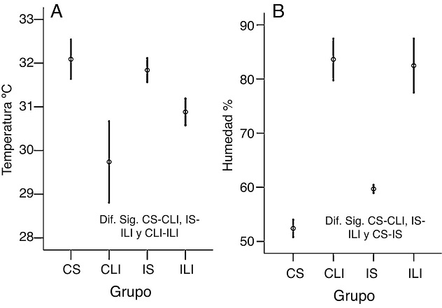Durante la realización del trabajo se registró una mayor temperatura ambiental y menor humedad relativa durante la estación seca, lo cual se debe a que en ambos sitios la vegetación predominante es el bosque tropical caducifolio, vegetación que pierde la mayoría del follaje durante dicha estación, permitiendo la entrada de los rayos del sol (Gienger et al., 2002) y el aumento de la temperatura bajo el dosel. Sin embargo, también se observó una menor fluctuación de ambas variables en la isla San Agustín. Esto puede deberse a que en la isla, a diferencia del continente, el viento sopla gran parte del año (Conanp, 2008), levando humedad (Hill y Lee, 1957) y temperatura a su interior (Bovo, Marques y Andrade, 2012) y consecuentemente, podría amortiguar las altas temperaturas y bajos porcentajes de humedad relativa.