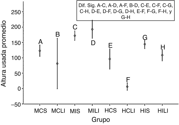 La temperatura ambiental (K-W test = 45.02, df = 7, p < 0.0001) y la humedad relativa (K-W test = 426.06, df = 3, p < 0.001) presentaron diferencias significativas entre sitios; sin embargo, la temperatura en ambos lugares fue similar durante la estación seca, pero mayor en la isla que en el continente durante la estación lluviosa (fig. 1A). La humedad relativa fue similar en ambos sitios durante la estación lluviosa, pero mayor en la isla durante la estación seca (fig. 1B). Se obtuvo información de la altura de la percha utilizada por 602 individuos en total durante los recorridos en los transectos, que corresponden al uso de percha de 29 hembras continentales, 82 machos continentales, 70 hembras insulares y 421 machos insulares. Se registraron diferencias estadísticamente significativas en la altura de la percha usada entre sitios y entre estaciones (K-W test = 55.53, df = 7, p < 0.001), los machos percharon a mayor altura que las hembras en ambos sitios, mientras que las hembras y los machos insulares percharon a mayor altura que sus contrapartes continentales. En ambos sitios, las hembras percharon a mayor altura durante la estación seca (fig. 2).
