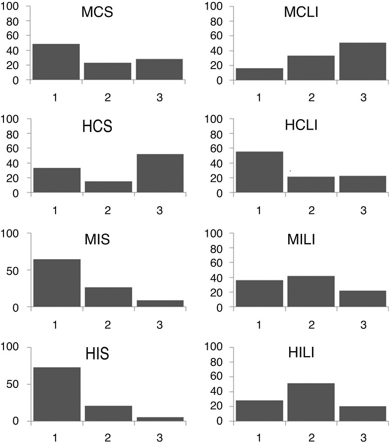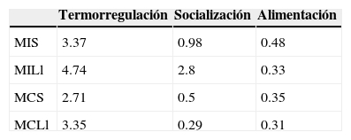 No se registraron diferencias significativas en los movimientos dedicados a termorregular (K-W test = 5.3, df = 3, p = 0.15), socializar (K-W test = 5.85, df = 3, p = 0.11) o alimentarse (K-W test = 0.52, df = 3, p = 0.91) entre ambos sitios (tabla 3). La frecuencia de movimientos que realizan a lo largo del día no presentó diferencias significativas (K-W test = 12.91, df = 7, p = 0.074) entre sitios. Machos y hembras continentales presentaron actividad bimodal durante la estación seca, pero no durante la estación lluviosa (fig. 3), mientras que machos y hembras insulares disminuyeron su actividad conforme avanzó el día durante la estación seca, pero no durante la estación lluviosa (fig. 3).