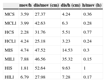 Se lograron observaciones focales de 61 individuos, 34 en la isla y 27 en el continente, que totalizaron 348 h de observación, 161 h en la isla y 186 h en el continente. El tiempo promedio de observación por individuo fue de 4.8 h en la isla y de 6.91 h en el continente. Ya que los datos obtenidos se analizaron por individuo, los análisis que se presentan a continuación se realizaron con un tamaño de muestra de 61, a menos que se indique lo contrario. La comparación entre machos de ambos sitios registró diferencias significativas en la frecuencia de movimientos por hora (K-W test = 24.11, df = 7, p = 0.001), en la distancia total recorrida por movimiento (K-W test = 14.19, df = 7, p = 0.047), en la distancia total recorrida por hora (K-W test = 24.11, df = 7, p = 0.001) y en el tiempo que transcurre entre movimientos (K-W test = 27.035, df = 7, p = 0.0003). En promedio, las lagartijas insulares se movieron más frecuentemente, recorrieron mayor distancia por movimiento y se desplazaron más que las continentales (tabla 1). En los machos insulares se registró mayor frecuencia de movimientos por hora, distancia por movimiento y distancia recorrida por hora, que en los continentales (tabla 1). Durante la estación lluviosa se registraron los valores más altos de movimiento por hora (tabla 1). El tiempo entre movimientos indica que los machos de la isla y durante la estación lluviosa son más activos (tabla 1). Las hembras presentaron similitud en su actividad tanto entre sitios como entre estaciones, excepto en los movimientos por hora que fueron mayores en la estación lluviosa y en la isla (tabla 1).