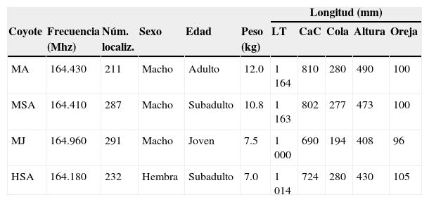 Se capturaron 4 coyotes: un macho adulto (MA), un macho subadulto (MSA), un macho joven (MJ) y una hembra subadulta (HSA). Sus pesos van de 7.0 a 12 kg, y su longitud total de 1,000 a 1,164 mm. El primer coyote capturado fue el MA, en enero de 2001; sus últimos datos se obtuvieron en febrero de 2002 y fue el ejemplar de mayor peso y tamaño. El segundo coyote fue un MSA, se capturó en septiembre de 2001 y su último registro se obtuvo en noviembre del 2002. El tercer coyote fue una HSA, su captura se realizó en marzo de 2002 y su último registro fue en mayo de 2003. El cuarto coyote fue un MJ, se capturó en septiembre del 2002 y sus últimos datos se obtuvieron en agosto de 2003 (tabla 1). Durante todo el estudio se utilizaron 1,021 localizaciones para los 4 individuos. Para el MA se consideraron 211 localizaciones, para el MSA fueron 287, para el MJ se obtuvieron 291 y, finalmente, para la HSA fueron 232 (tabla 1).