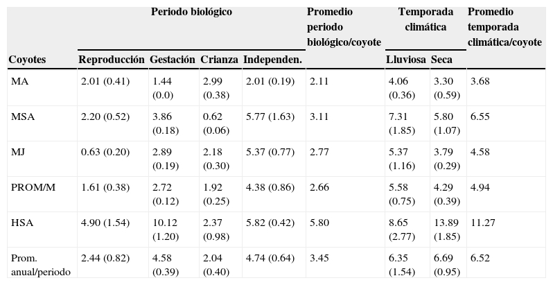 El primer coyote atrapado en el área comunal de Ixtepeji fue el MA; este fue capturado en el periodo biológico correspondiente a la reproducción, probablemente se encontraba en busca de pareja, de acuerdo con lo registrado en los bosques templados del Norte de México, en donde este periodo ocurre del 16 de diciembre al 28 de febrero, y es el periodo donde ocurre el apareamiento en las parejas reproductivas (Servín, 2000; Servín y Huxley, 1995). Dos organismos más MSA y MJ fueron capturados en la época de independencia, periodo en el cual las crías se independizan de sus padres para buscar alimento, continúan viviendo en el mismo ámbito hogareño (Holzman et al., 1992; Servín, 2000). Finalmente, la HSA fue capturada en lo que corresponde al periodo biológico de la gestación, que es el lapso en el cual las hembras están gestando, dando a luz o cuidando a los cachorros, aunque este no fue el caso. El valor promedio obtenido para los machos (2.66 km2) es relativamente bajo comparado con el registrado en Canadá, de 9.5 km2 (Parker y Maxwell, 1989), en los pastizales semiáridos de Texas de 4.5 km2 (Andelt, 1985), en la Reserva de la Biosfera de Mapimí de 6.87 km2 (Hernández et al., 1993) y en el desierto chihuahuense de 5.6 km2 (Windberg, Steven y Brian, 1997).